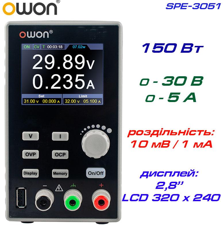 SPE3051 OWON – лабораторний, програмуємий одноканальний блок живлення, потужність 150 Вт, напруга: от 0 до 30В і струмом от 0 до 5А.
