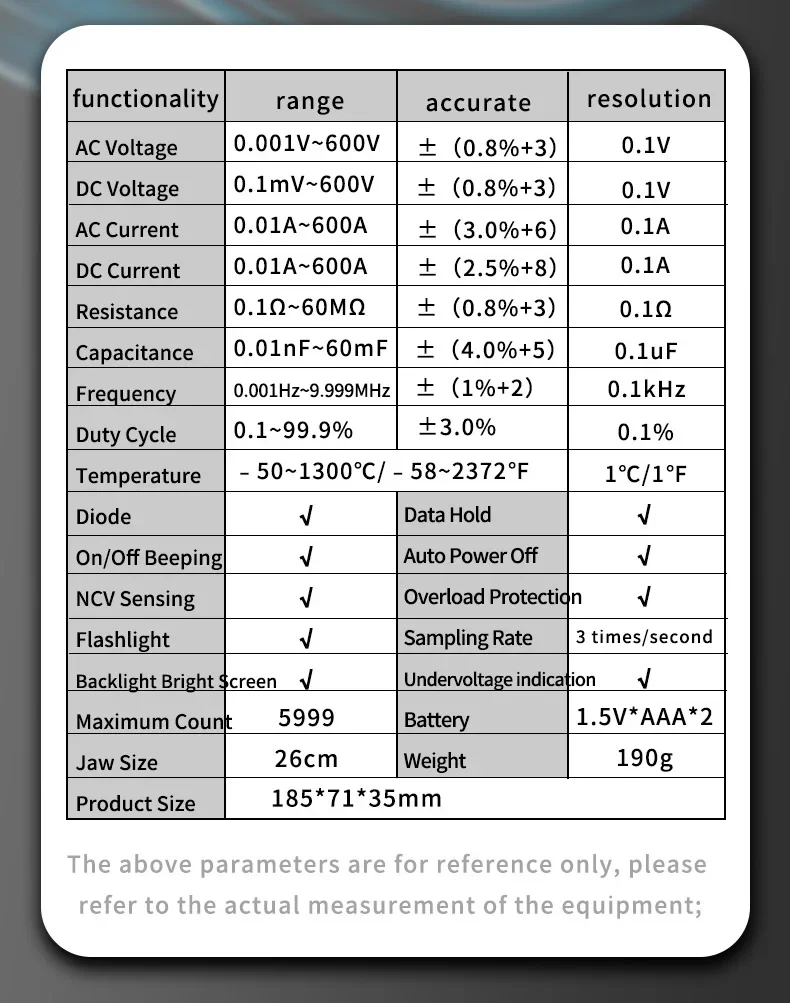 • Функції вимірів: ток AC/DC, напруга AC/DC, опір, ємності, частоти, температури, тест діодів, тест провідності